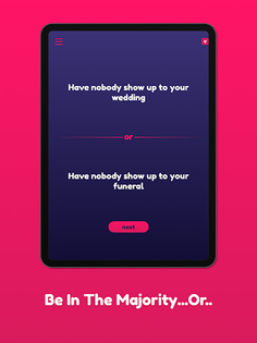 Get a bunch of friends gathered. The app will display two scenarios at the time. Everyone votes for which scenario they prefer, and the ones who vote for the least popular scenario loses!
