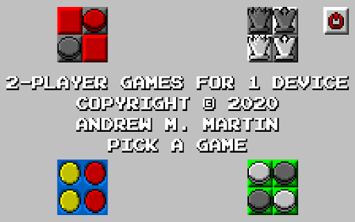 Two players can take turns playing these games on one device: Chess, Checkers (or Draughts), Othello (or Reversi), Four In A Row (try to connect four pieces in a row). Nothing fancy. No online games, no AI for solo games. No ads, no connection required, no special permissions required. Just four classic games in one small package.