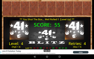 > Ultimate goal is to “shut the box”(STB) by scoring all 10 numbers on the board (+1 level, +3 retries, and +1 reroll).