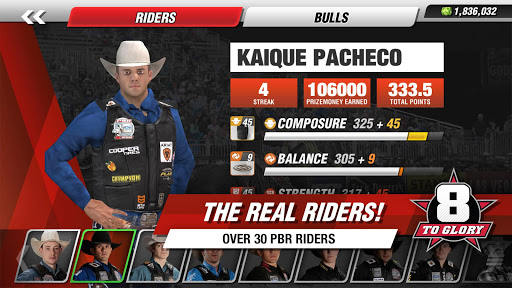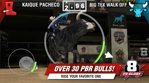 8 to Glory serves as the PBR's official bull riding game and is the sole authentic bull riding experience for mobile devices. Would you dare to outlast the bucking bulls for at least eight seconds? Containing over 30 bona fide riders including Ryan Dirteater, Jess Lockwood, Fabiano Vieira, Joao Ricardo Vieira, and Derek Kolbaba, and Kaique Pacheco, 8 to Glory challenges you to exhibit your proficiency by riding some of the world's fiercest creatures such as Magic Train, Long John, After Party, and many more. Only the best and most accomplished riders qualify to showcase their champion status in this pulse-pounding game involving the roughest sport worldwide.
