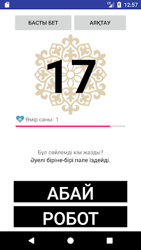 Robot with Artificial Intelligence found Abay’s “Book of Words”. It liked the book so much, that started to write own sentences and merged it with “Book of Words”. Now, everyone who reads Abay’s “Book of Words” cannot distinguish Abay’s sentences from AI’s. Therefore, today World needs a Hero more than ever. To find such a brave & intelligent hero we created a game, where you need to identify where the sentence belongs to AI or Abai. The more and faster you answer, the more points you get. You have only 3 chances to loose. Hero will be the one, who got the highest score. Who knows, maybe it is You who should be the Hero. Download and prove!