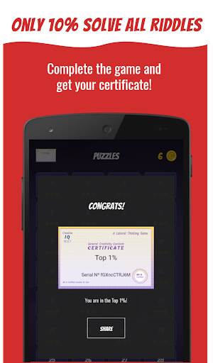 Solve an array of tough riddles and obtain your creativity IQ certificate! Many levels might appear unfeasible, but the key lies merely in unconventional thinking. Embrace the game, and you'll unravel entertaining and informative features on your device in no time.