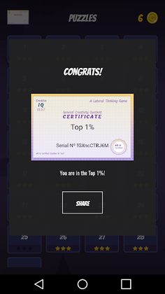 Finishing the game grants you your Creative IQ certificate. Compare your progress with friends and family and revel in your prowess! This indie game thrives on your appreciation. Feel free to rate the game, leave a comment or suggest a fresh level if you're fond of these puzzles.