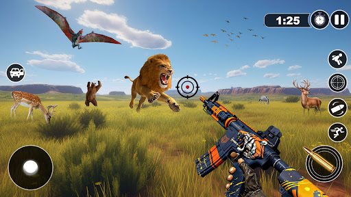 Enter a world teeming with real wild animal hunting games, each native to their specific regions. Roam through diverse and authentic hunting grounds across continents in hunting simulator. Become a big buck hunter & target a majestic big buck, a sly fox, a fierce coyote, or a formidable bear in the rugged landscapes & wait patiently for a massive animal world war in this animal adventure games . Embark on a captivating mission to capture a dinosaur in the dinosaur hunting games, and brace yourself for countless extraordinary encounters – all on your mobile device in Animal games hunting simulator.