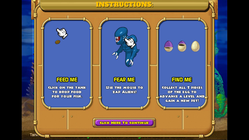 This is a virtual pets simulator with a blend of elements from action, strategy, and puzzle video games. The game can be played in five modes: Adventure, Time Trial, Challenge, or Virtual Tank. In Adventure mode, a player advances through four tanks, each with five levels. In each level the player must earn enough money to buy three egg pieces to advance to the next level. During an initial playthrough of insaniquarium, feeding fish and fight against aliens, at the end of each level of a tank, the player receives a new pet from the egg. While 28 pets can be earned throughout Adventure mode, each level requires the player to pick three pets. Each pet can aid the player during gameplay. There are bonus rounds where the player can collect shells, which can be spent to place fish in the Virtual Tank.