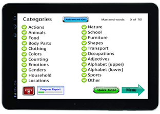 This app teaches a child with hundreds of images in 22 categories: Actions, Animals, Food, Body Parts, Clothing, Colors, Emotions, Genders, Household items, Locations, Nature, School, Furniture, Shapes, Transport, Adjectives, the Alphabet (lowercase and uppercase), Sports and Others.