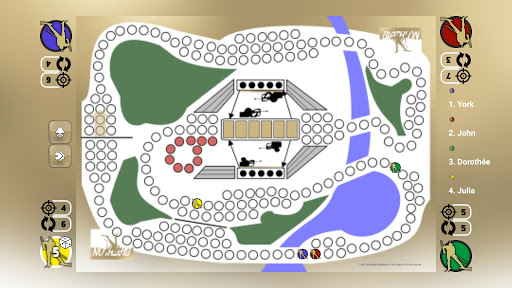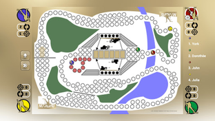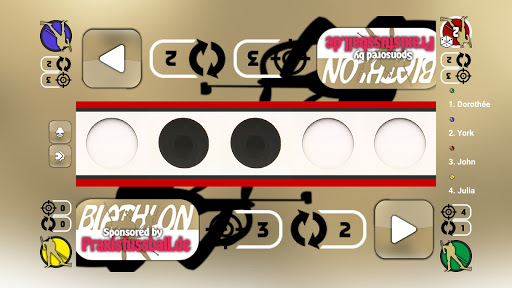 4. At the corners of the board are the buttons for throwing the dice. If you press the "starting shot" button with the pistol, the app randomly determines which player is allowed to start. Then the dice are rolled in clockwise order. It starts immediately.