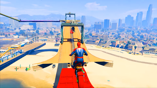 Ride on ramp bike for bike stunts in new stunt racing game on mega-ramp. Do freestyle stunts, crazy spider bike stunts and tricky spider stunts on mega ramps. This GT racing and bike racing is different from other bike racing games. In this spider bike game ,racing tracks and stunts are designed in the open sky for extreme bike racing . Are you ready to be a superhero bike racing spider rider then play this cool and colorful Superhero Tricky Bike Stunt Racing 2023 and make fun with superhero bike race for free.