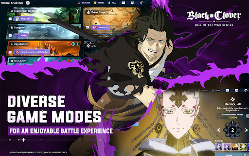 Rank up and improve your favorite characters by summoning mages and letting original Black Clover characters join your squad. Upgrade materials are available by using them in-game and strengthening your relationship with them through the Bond System. Rank up and Promote your mage all the way to the top regardless of grade and enjoy exclusive artworks on their character pages, plus various special costumes. Explore various dungeons for an enjoyable battle experience, including "Quest" which recreates the anime storyline, "Raid" for advanced challenges, "Memory Hall" to compete against bosses, "Arena" for thrilling PvP experiences, and "Time-limited Challenge" to face formidable enemies. Moreover, form your exclusive guilds and participate in "Squad Battle" with other members, offering multiple challenge modes to satisfy your battle desires!