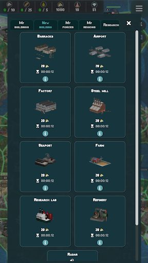 Develop your country with a wise choice of buildings placed on various types of regions with different bonuses. Upgrade your infrastructure to higher levels to improve your unit production speed as well as increased resource capacity.