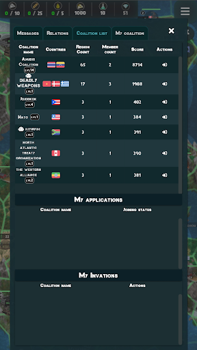 Form alliances with other players to conquer other regions on the map to win the game. Join coalitions or start a war against other nations to take their territories.
