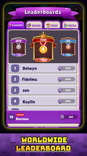 - 4 Modes block games: Classic Mode, Bomb Mode, Time Mode, Hexa Mode