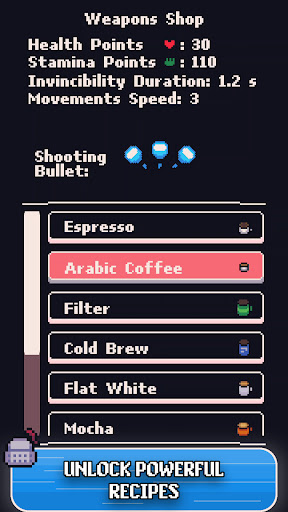 You can choose from more than 10 coffee recipes to start the run with different stats!