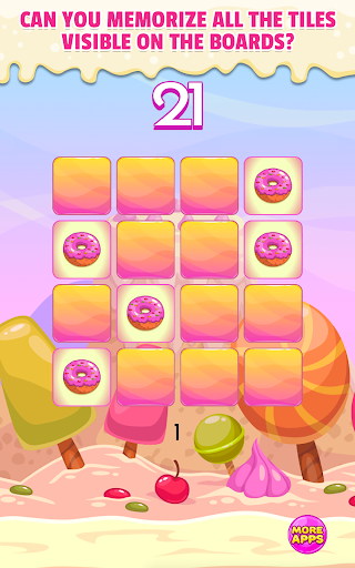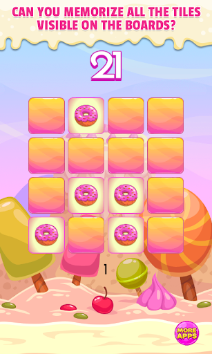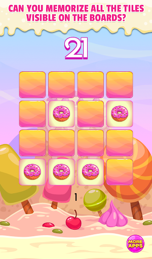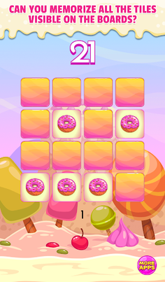 This is one of brain teasers which help you train your short-term memory and visual memory. Can you memorize all the tiles with sweet cookies on 3x3 board? It's simple! So maybe you try do this on 4x4, 5x5 and 6x6 board. Quite difficult, right? Are you ready to take challenge and test your memory?