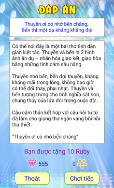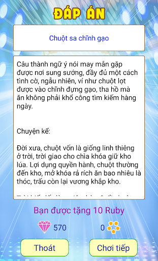 Especially all, with each answer you answer correctly, the commentary, interpretation, dissection significance for fishing knives, proverbs, idioms that help you grow intellectual capital, increase understanding of folklore Vietnam. You will be more, to be more of the layers of meaning behind it, the profound content that you may be extremely surprised when known.