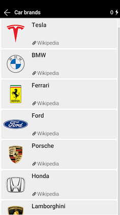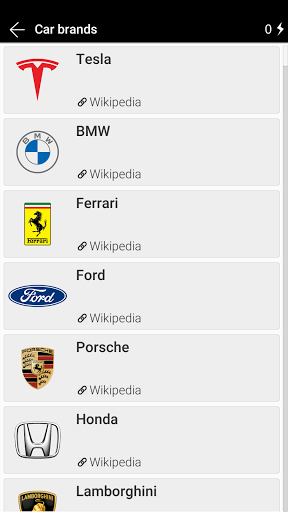you can use the list of brands and learn the names, and then take the test. Each logo card contains an image, a title, and a link to a Wikipedia page.