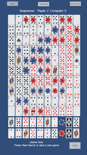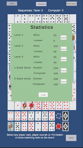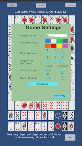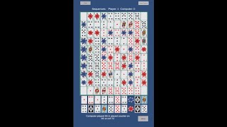 The object is to place counters on the board to form lines of 5 counters horizontally, vertically or diagonally by matching board cells to cards in your hand. Each line of five counters is called a "Sequence" and to win a game the player must form a specified number of Sequences (1, 2 or 3) before the computer opponent.
