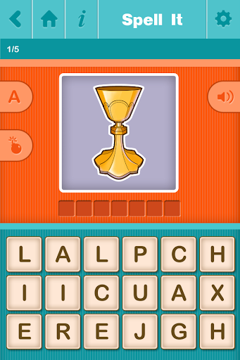 • SPELL IT: An image appears and below it are letter tiles. Tap the tiles in the right order to spell the object’s name. Additional unused letters make the game more difficult—an option that can be disabled in the settings panel. Tap the speaker icon to hear the word. If you need help, tap on the “hint” icon and a few of the letters will fall in their correct order. The game tests memory recall and improves written communication by practicing spelling.
