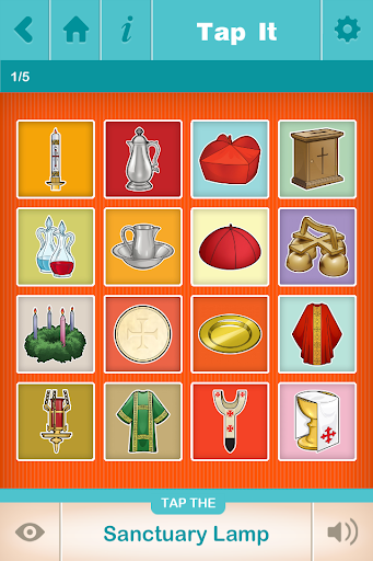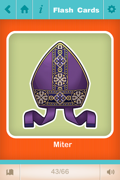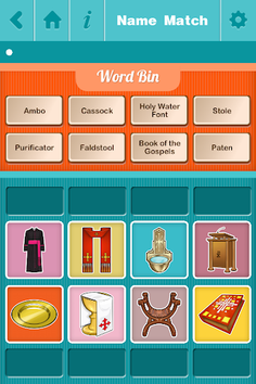 • TAP IT: Is it an “aspergillum”, “mitre” or “surplice”? Find out by playing “Tap It”! Hear the name of an object, then tap the right picture. See how many you get correct before time runs out. Pick how many images to include in the “Tap It” game to make it easier for little ones or more challenging for older kids. You can optionally display the word instead of (or in addition to) hearing it’s name. Helps teach word association and image recognition.