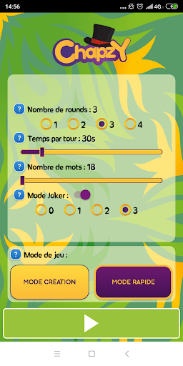 Créez de 2 à 5 équipes pouvant contenir jusqu'à 5 joueurs chacune, choisissez le nombre de rounds, de jokers, de mots à faire deviner et le temps dont vous disposez.