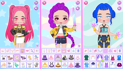 Now you can make your character and become an incredible girly designer by dressing up girls. Name it Lily, Toca, Magic or Yoyo, or however, you want. You can use your chibi doll as a cute anime avatar for social networks, or create your fashionable life stories with your anime princesses. Try the Gacha wheel, surprise your friends, unleash your imagination, and upgrade your creative skills in the fashion DIY world game! Become a doll designer easily!