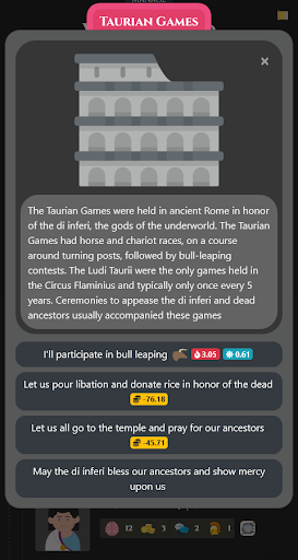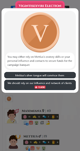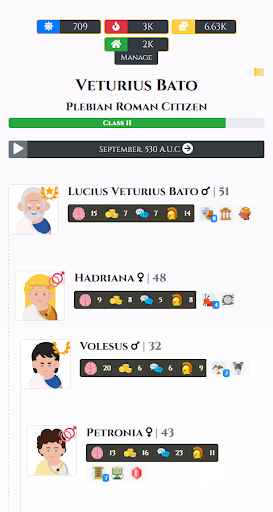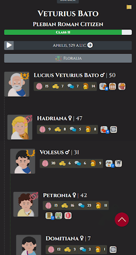 Live the life of an Ancient Roman family, climbing the social and economic hierarchy, facing setbacks and aiming to land the Consulship. No game over, just experiencing and having fun.
