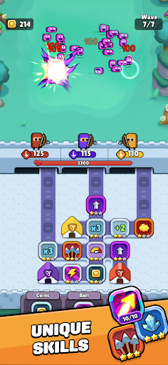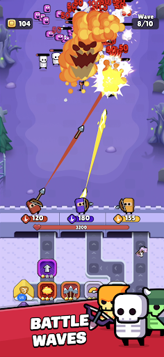 Defeat enemy waves to earn coins, then spend them between waves to: