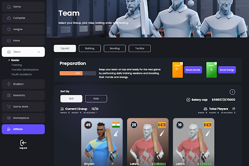 Each cricket player on a team has different skills and skill levels: speed, strength, stamina, and accuracy stats are all differentiators (the higher, the rarer), and each of these players is generated as a digital collectible with the option to level up and increase their stats and abilities. When teams win matches, they win the game’s in-game currency, which evolves their players and allows their team to level up. Cricket player collectibles that reach a certain level can be bought and sold through a dedicated Marketplace.