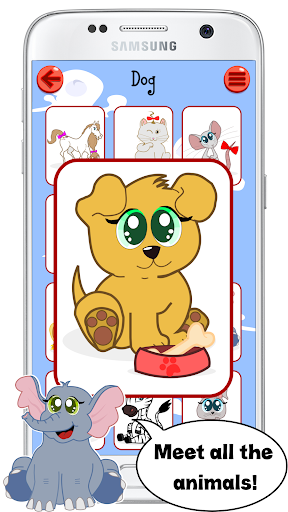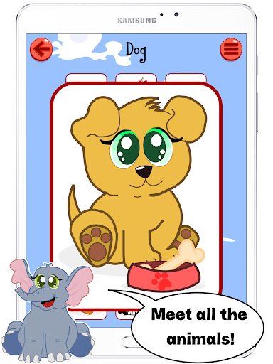 🐱 Meet The Animals – tap the card with a cat, dog, fish, bird or any other animal on it and you will see and hear its name in English. In that way, with this learning app, you can teach your kids all the kinds of animals and the English words for them at the same time.