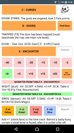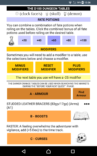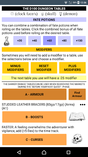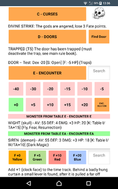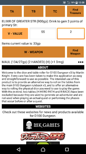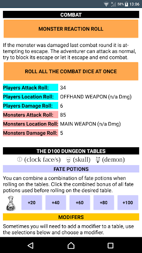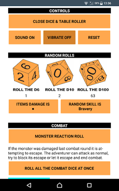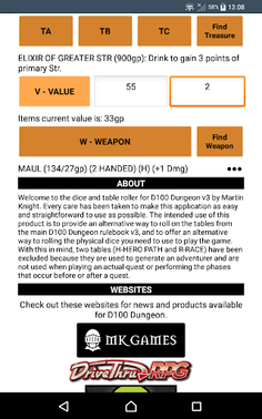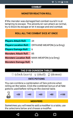 This is the official app for D100 Dungeon v3 that can be used to roll the dice used in the game, and to roll on the many tables found throughout the rule book.