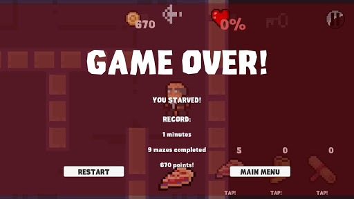 Ao morrer, você pode ver seu recorde de tempo, número de labirintos completados e pontos.