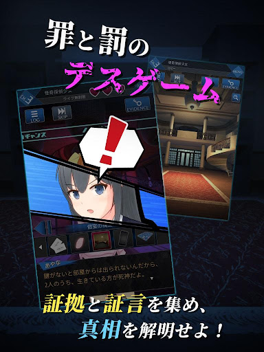 「この5人の高校生たちの中に死神がいる」 死神の凶行を乗り越えた先に行われる投票ゲーム。 このデスゲームに勝たなければ、"死神の館"から脱出することはできない。 記憶を失った主人公に襲いかかる、絶体絶命のピンチ。 論理と証拠で無実を証明せよ! ◆館を探索して手がかりを見つけろ! 事件現場や館内をくまなく調査し、証拠や参加者たちの証言を集めよう。 些細なことも、事件の大きなカギとなる! ◆白熱する議論で犯人を暴け! 投票ゲームで一番投票数が多かった者は"死神の館"で居残りとなる。 集めた証拠を議論でつきつけ、真相を解き明かそう!
