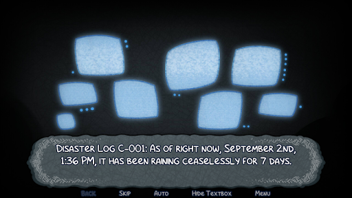 The Disaster Log C-001 depicts a catastrophic incident, where it's constantly raining for 7 days straight as of September 2nd, 1:36 PM. In the past century, no one has ever experienced anything quite like this before, and it's affecting the island's inhabitants drastically. Experience an enthralling journey through this apocalyptic rain through the visual novel called Disaster Log C.