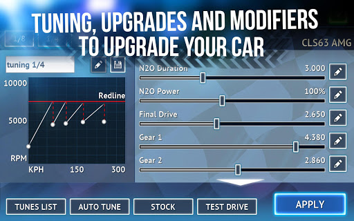 Upgrade your car with advanced car parts and modifiers. Adjust your gear ratios and use nitrous oxide to give your ride an extra kick. The most realistic physics engine in the genre means that everything works the way it does in real life. Finding the perfect balance between power and grip while staying in your class is crucial.