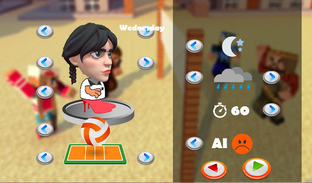 Choose the Wednesday Addams character and immediately challenge your opponent in the parody city.