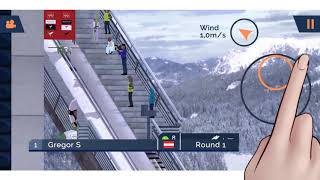 To start jumping, tap the circle once. Hold the circle to jump, and move the wheel up quickly to release it just before landing. There are three landing options to choose from; telemark landing (move the circle up and release), squat landing (move the circle in the middle and release), and crash landing (move the circle down during landing or don't release at all). The game is based on physics, so the moment of the jump is significant. Jump just before the in-run ends to achieve the best results. After jumping, you can control the inclination of the ski jumper. Set the control wheel to the middle, then release the touch and move the circle up just before the jumper touches the ground to finish the jump with telemark and achieve the highest score.