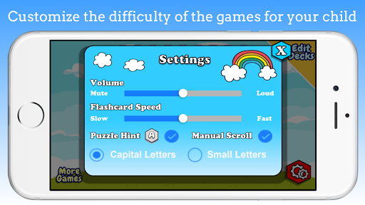 (4) Option to auto play the flashcard in each deck or manually scroll through them. Auto scroll speed can also be adjusted to encourage your child to read along as the flash cards play.