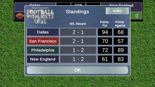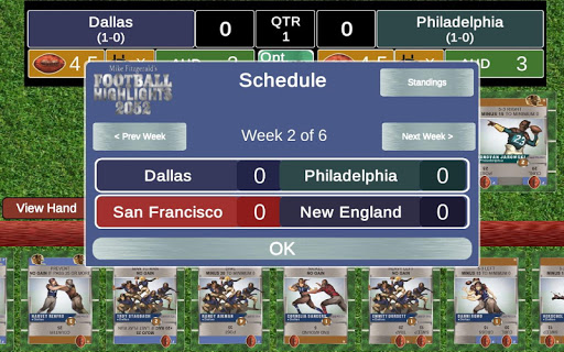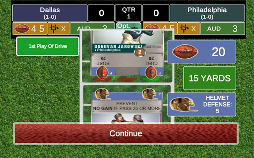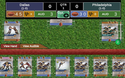 In this quick and interactive game, two players manage their teams, combining both strategy (building your team) and tactics (playing the game) without any downtime. During each half, players alternate playing ten cards to simulate a full game's highlights. Each card represents both an offensive and a defensive play, both of which will be used to resolve your opponent's and your own offensive plays.