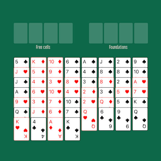 Four free spaces allow cards to pass through (one at a time), and four stacks of bases allow cards to be discarded (starting with the Ace and going up to the King in the same suit).