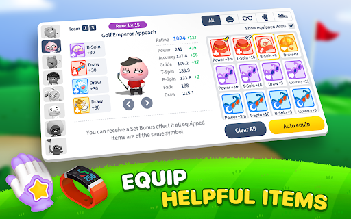 Collect Kakao Friends characters, gear them up with the latest golfing equipment, upgrade their skills and challenge rivals in 1v1 real-time multiplayer golf matches!