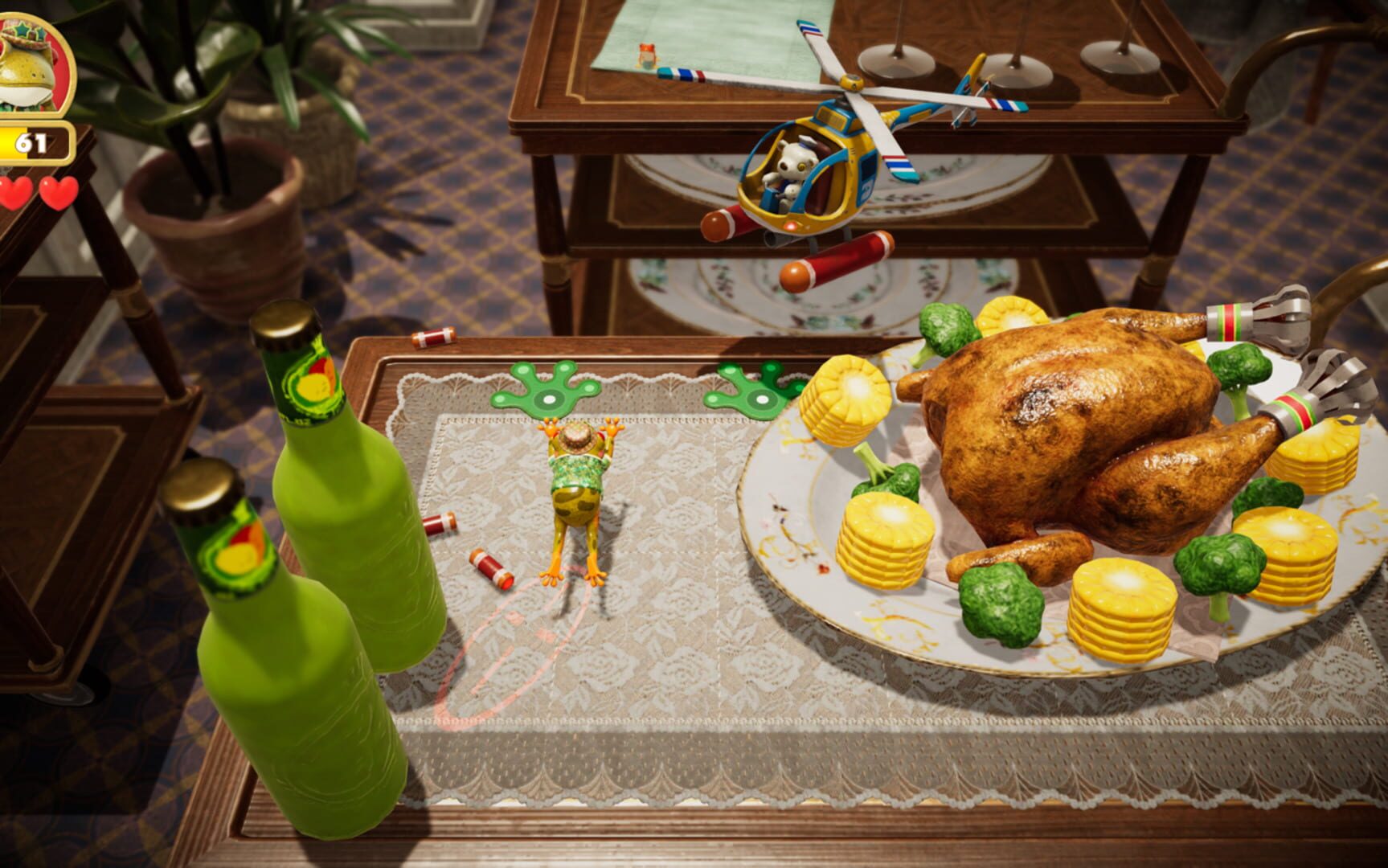 Help Frogger rescue stranded froglets in dangerous human houses featuring over 400 stages and 20 costumes, with co-op mode.