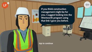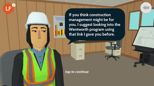 Players are challenged to explore the entire site, talk to all managers, and consider whether they would be suited for a career in construction management. Additionally, Future Construction Managers offers players in-game links to the construction management program at Wentworth Institute of Technology.
