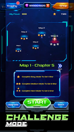 - Challenge Mode presents a test against various formidable enemies with unique movements. Use your skills to defeat these enemies and upgrade your fleet to confront the strongest foes in galaxy attack.