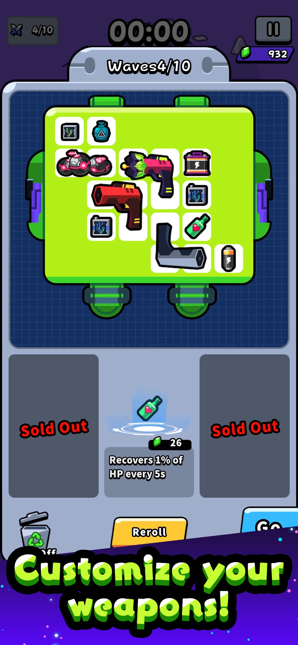 3. Buy weapons/gear and place them in your backpack; merge, sell, or reroll when needed.