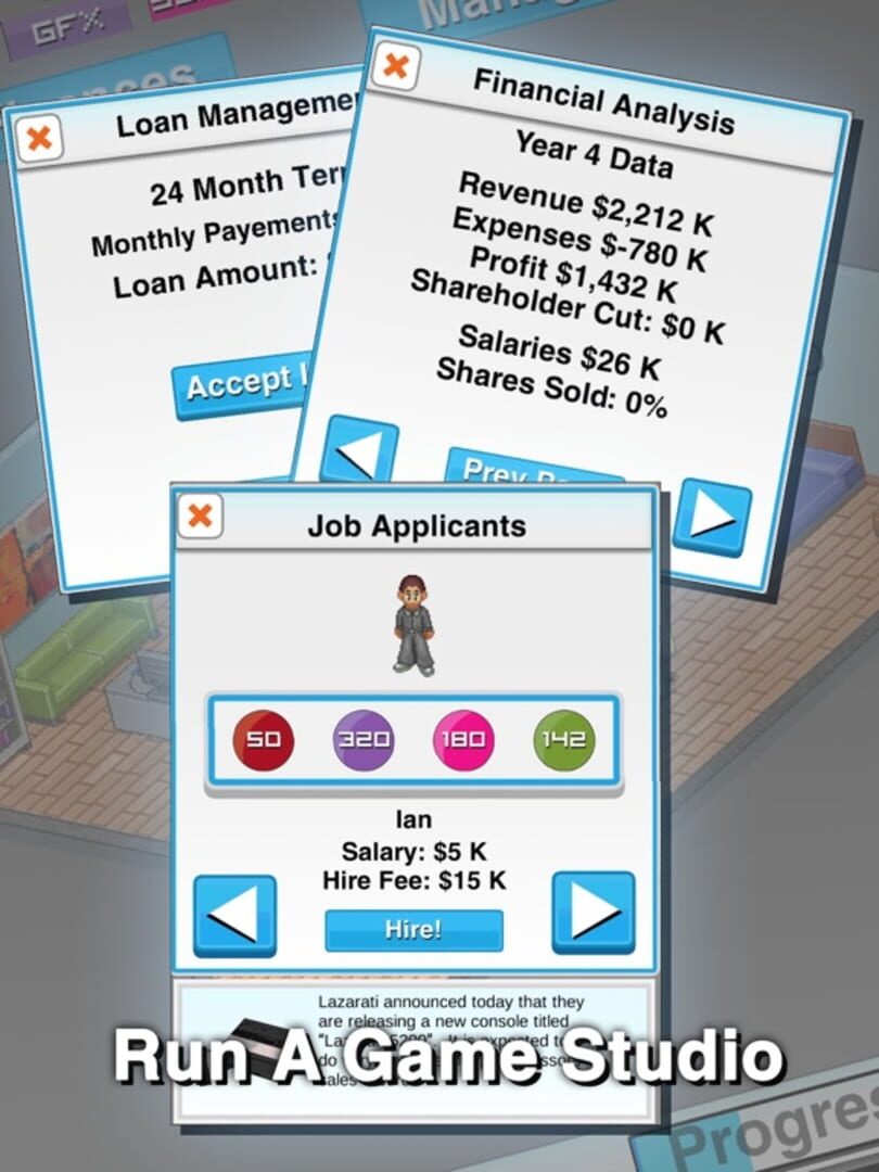 Venture into the competitive gaming industry and try your hand at crafting games that are compatible with over 40 different platforms. Choose the level of investment and keep the studio's finances in check to ensure its stability. Be a boss to yourself, manage and oversee the successful continuity of your gaming company.