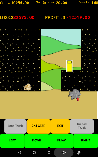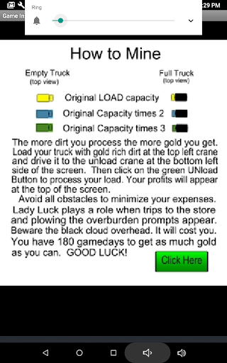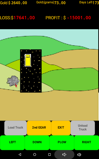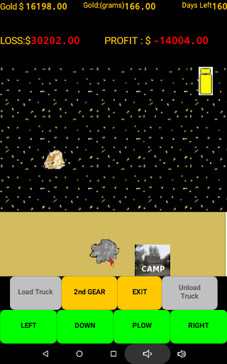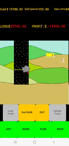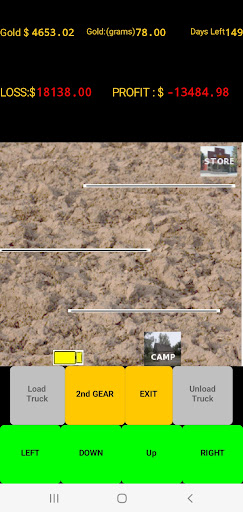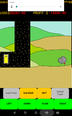 When you feel you have found the right spot then begin mining. Load your truck with pay dirt and drive to the processing plant. Beware all the profit eating obstacles that await you. Plowing the overburden can be very rewarding but all those trips to the store and the weather will test your patience. Beware of the many other unexpected expenses that pop up and eat away your time and profits. You have 180 game days (approx. 30 minutes ) to get it done. (A game pause button has been added). Do you have what it takes to be the most profit making gold mining millionaire? GOOD LUCK!