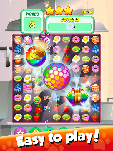 Greedy Cat Match 3 is a casual, relaxing puzzle game where you match colorful food to feed a greedy cat.