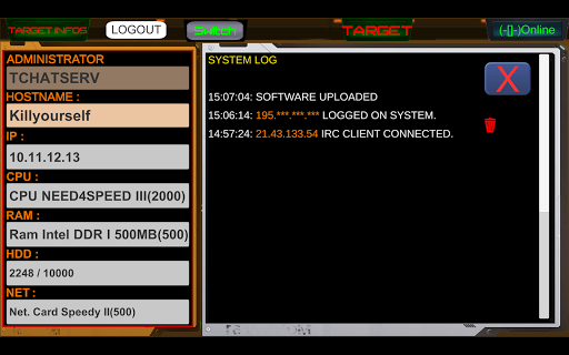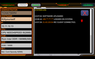 From theses windows, you should try to find ingame IP to HACK, then look after critical datas. This is main HACKER task.