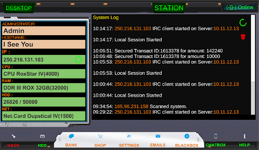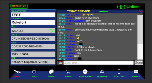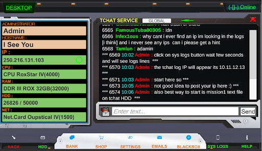 In this Hackers world you will get a basic computer station with a SYSLOG screen and TCHAT window.