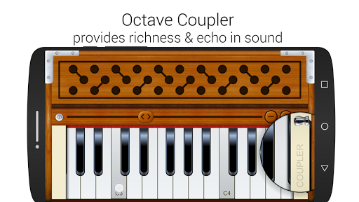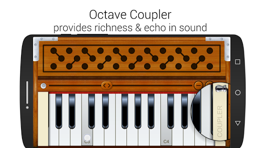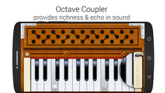 Coupler - Coupler provides the effect of richness in the sound of the harmonium by adding sounds of an octave higher notes to the notes which you play.